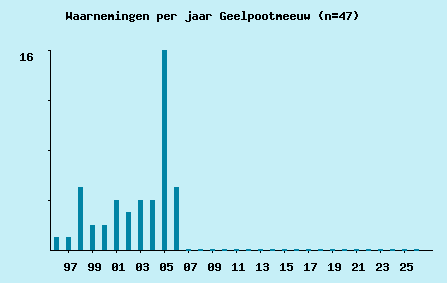 | 2005-09-02 | 5 | 0 | 0 | 1 | 4 | strand Egmond aan Zee | : | Naast de nodige niet te determineren meeuwen in ieder geval: 1 1e winter, 1 3e winter, 2 4e winters en 1 adulte geelpootmeeuw. Ik zal julle niet vermoeien met de 'bewijsplaatjes' van de 5 geelpoten (al was de 1e winter erg leerzaam). Naast bovengenoemde meeuwen ook nog een hybride zilver x kleine mantel of geelpoot x kleine mantel. | LE |