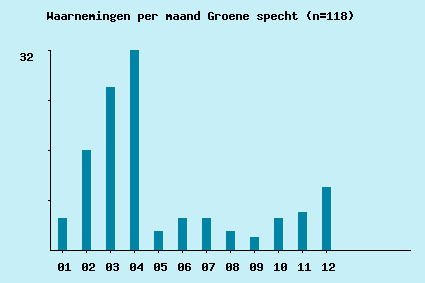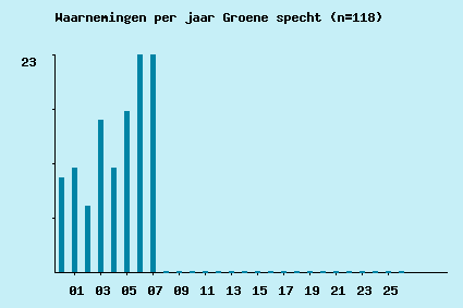 | 2003-07-05 | 2 | 1 | 1 | 1 | 1 | Tuin Gortersweg, Schoorl | 19:12: | Groene spechten zien we regelmatig in de tuin. Maar op deze dag was er een volwassen vrouwtje aan het fourageren, en in haar buurt zat steeds een onvolwassen, prachtig gespikkeld jong. Ze zijn ongeveer een uur in de tuin geweest. | MvL |