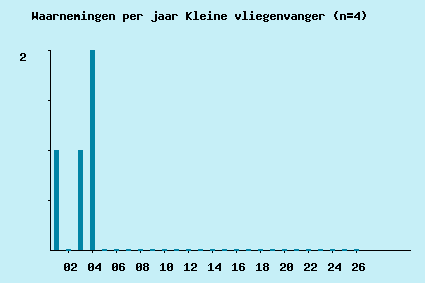 | 2004-05-18 | 1 | 0 | 0 | 0 | 1 | omgeving Bokkesprong, Groet | 14:52:41 | Vanmiddag bevond zich een Kleine Vliegenvanger een 2e kj. man in eenelzenbosje ongeveer 100 meter ten zuiden van de Bokkensprong in Groet. De vogel was regelmatig zingend te horen en ook mooi te zien. Het elzenbosje ligt rechts van het schelpenpadje vlak achter de omheining. | RB |